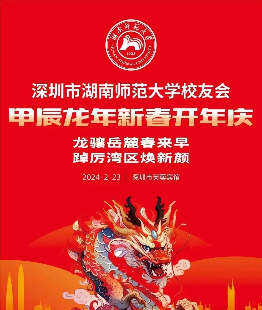 2月23日,深圳市校友会龙年新春开年庆在罗湖区芙蓉宾馆举行。湖南省人民政府驻深办副主任李永东,深圳校友会会长田地,顾问、深圳市教育学会会长金依俚,名誉会长刘晓明,副会长皮爱民,上海校友会名誉会长刘明耀等30余位校友代表欢聚一堂,共叙情谊。
